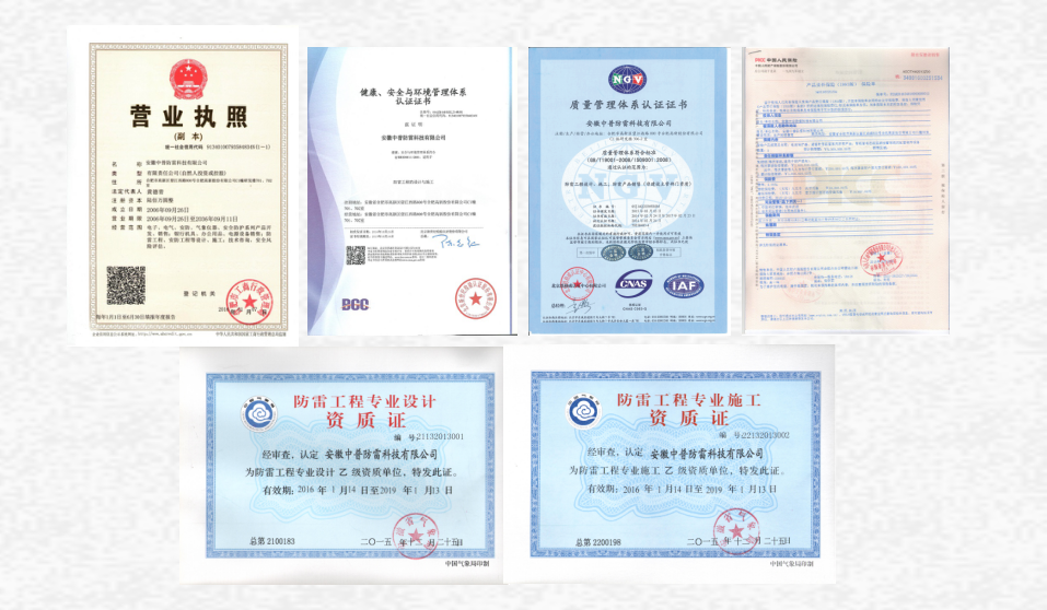 公司使用的产品均通过了北京雷电防护装置测试中心等国家权威性检测机构检测,具有CE、CCC等相关认证,以过硬的工程质量获得了中国人保的工程质量承保。